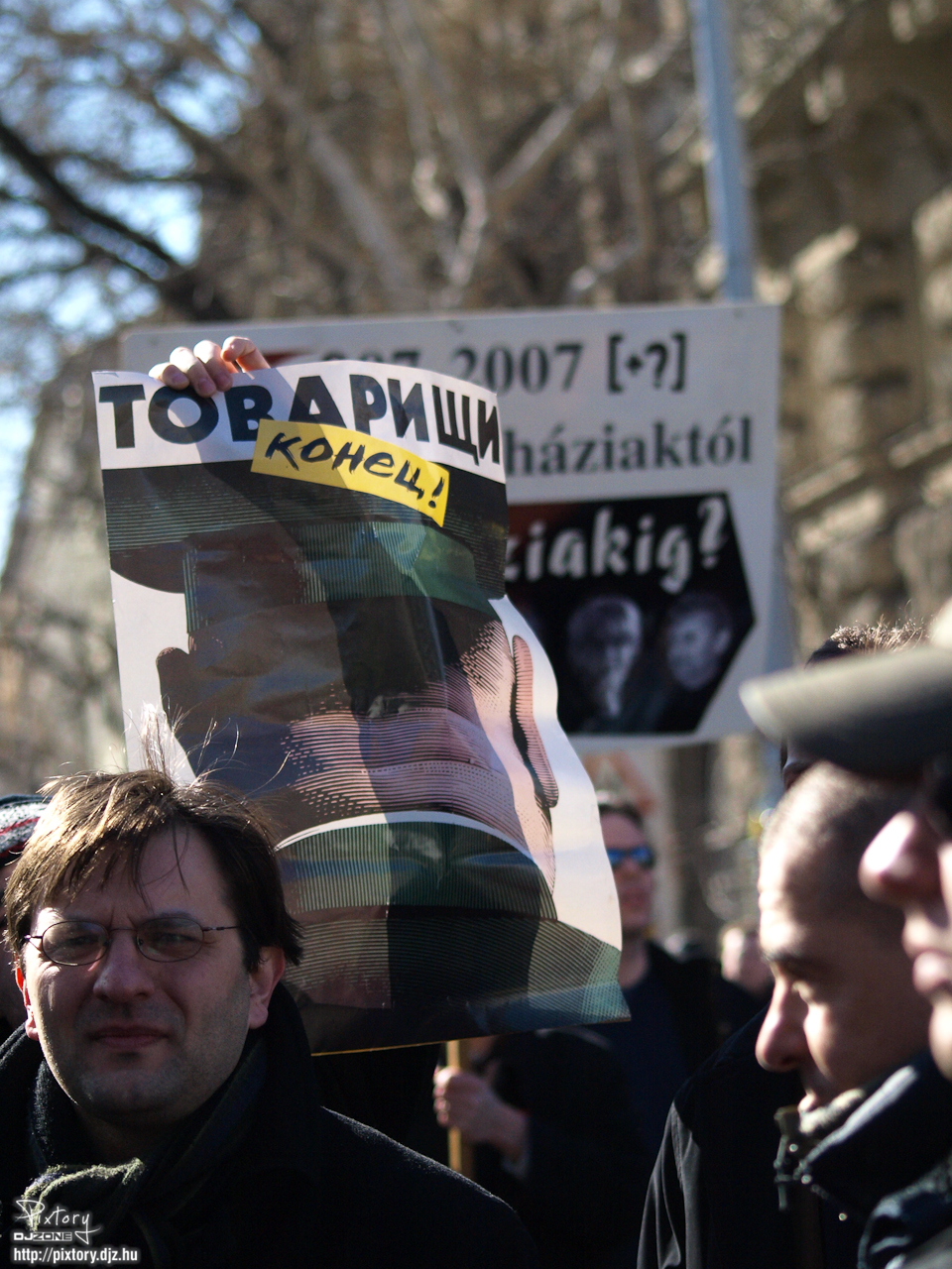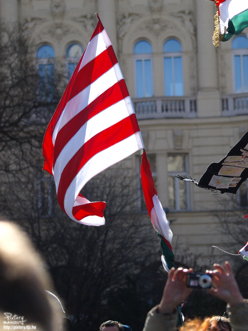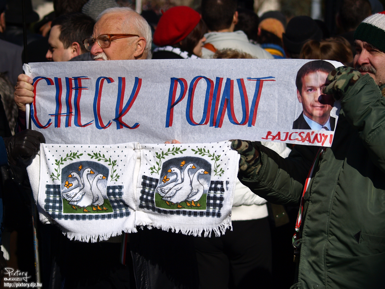 Az ellenőrző pont előtt egyébként 10-15 fős transzparenst tartó, zászlót lengető és bekiabáló csoportosulás volt. Gyakran jutalmazták az állami ünnepséget fütty koncerttel, de hallótávolságon kívül voltak, szóval a műsort érdemben nem zavarták.