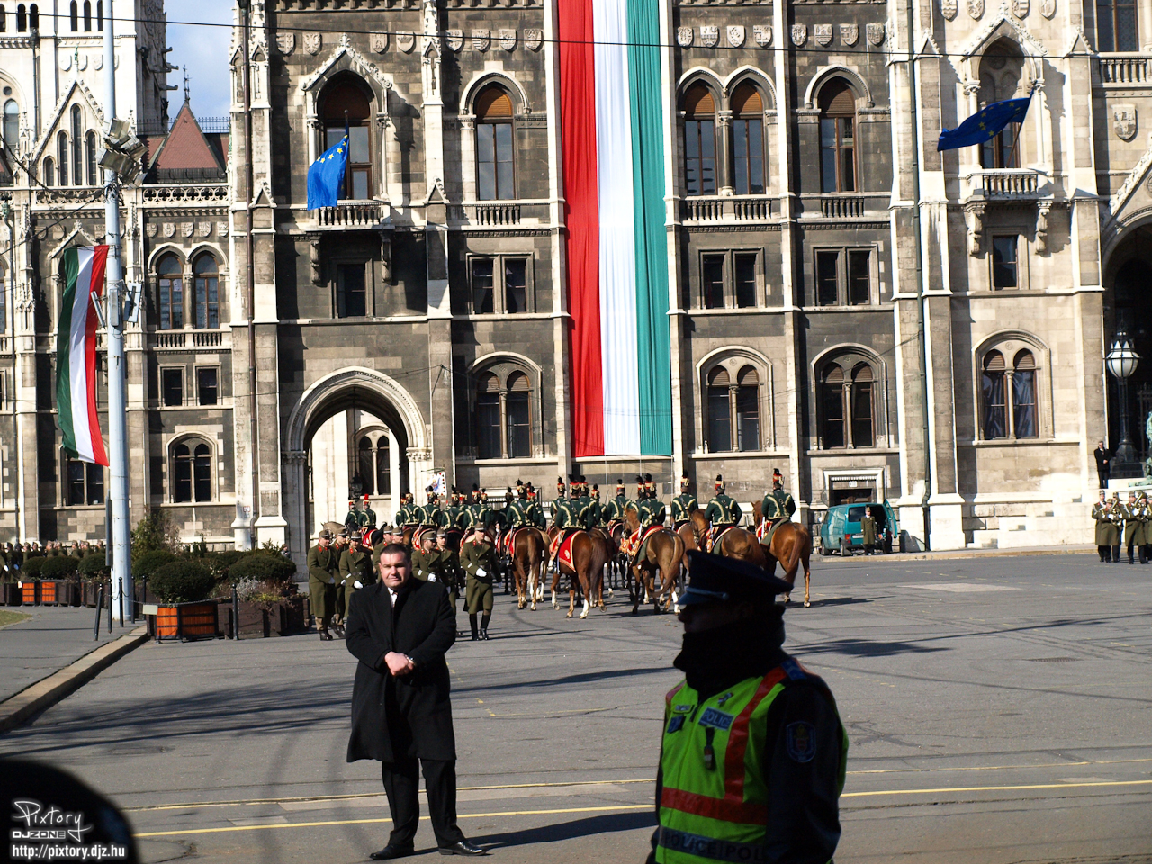 Több kisgyermekes szülő is kint volt, nyilván, hogy megmutassák nekik a „huszárokat”, de szerencsétleneknek esélyük nem volt semmit látni belőlük. Mire a bejutási herce-hurcán az embert túl jutott, nem az volt az érzése, hogy egy ünnepségen van. Bár, mi mást is várhattunk volna az állami ünnepségtől.