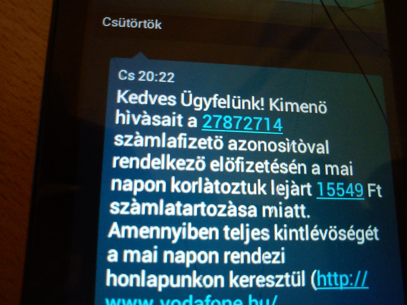 Erre kiderült, november 21.-én csütörtökön, hogy lejárt a tartozásom, és hogy ők most kikapcsolják az előfizetésem. Bárhogy nézem, 8 nappal korábban még nem volt tartozásom, ekkor pedig már kikapcsolnak. A slusszpoén akkor jött, amikor felfedeztem, hogy nem tudok netezni, sem telefonálni, akkor most így hirtelen befizettem az állítólagos tartozásom. Megkaptam az smst, hogy akkor újra telefonálhatok. Majd ezután 3 órával kaptam meg az sms-t arról, hogy számlatartozás miatt lekorlátozták a kimenő hívásaimat. Ez mégis micsoda?