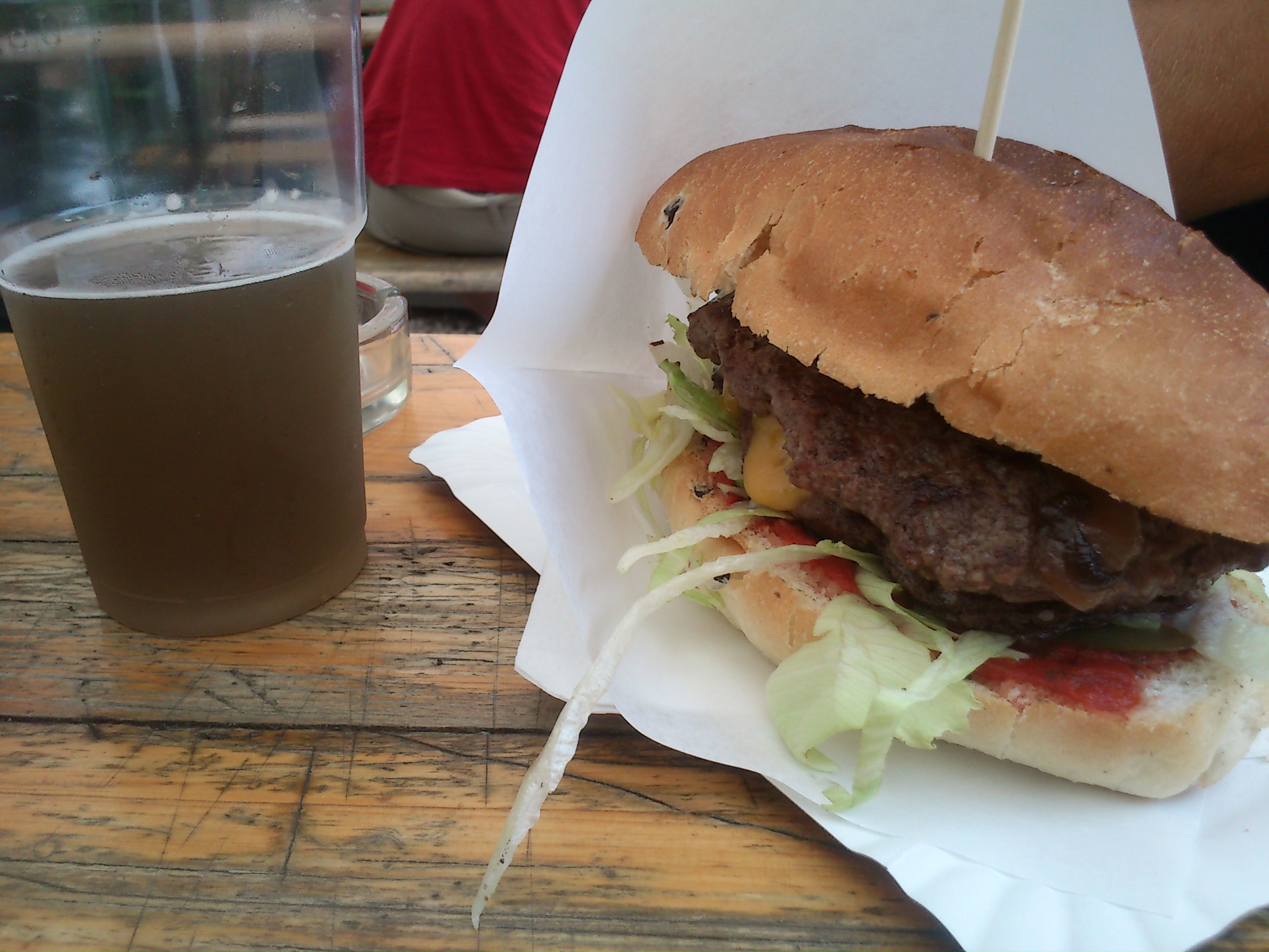 A bucinál szokás kezdeni az áskálódást, és eddig két különböző bucival ettem náluk, mindkettő jól működött, friss volt, nem morzsálódott, ami azért komoly előny. A zsenialitás a húsban van valahol, aljas módon feltételezem, hogy sörben pácolják, vagy locsolják vele, mert az íze különleges, és nem tudtam másra gondolni. Nem túl elvakult következtetés, egy hogy sörfőzdénél ugye. A sajtjuk jól olvad, és harmonizál a hússal és a karamellizált hagymájuk is jó. Szóval, az egész rendben van.